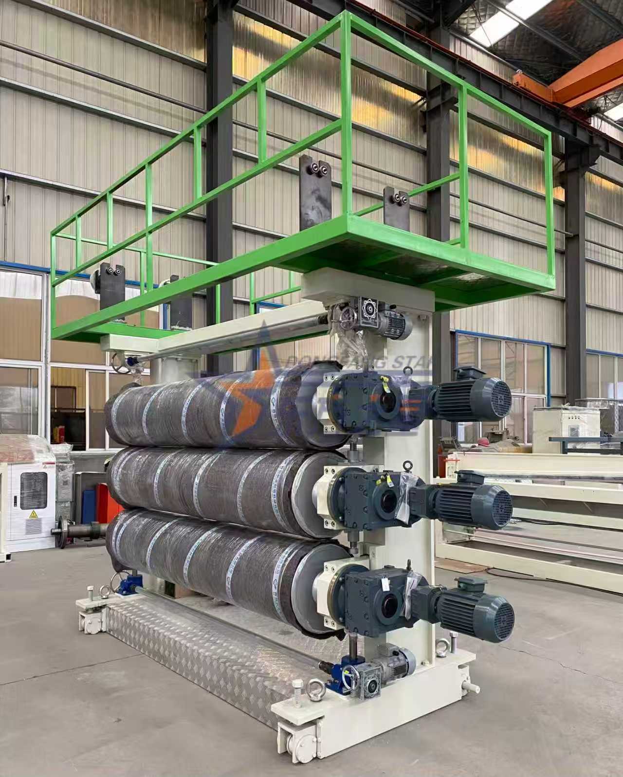 TheABS / HIPS lehtede tootmisliinsisaldab ka tsentraliseeritud kuivatussüsteemi, sealhulgas kuivsegisti ja vaakumkuivatit, et kaitsta niiskustundlikke materjale, nagu ABS, HIPS. Lehed kuivatatakse enne tühjendamist põhjalikult. Kolm rullikut tagavad täpse paksuse reguleerimise ja pinnatöötluse. Pärast pressimist jahutatakse lehed 8 meetri pikkusel jahutusraamil, millel on 26 roostevabast terasest rullikut ja seejärel transporditakse need lõpuks veomasinaga. KoguABS/HIPS-lehtseadmedtkasutab rahvusvaheliselt tunnustatud juhtimiskomponente, Näiteks temperatuuri reguleerimise süsteemis kasutatakse Jaapanist pärit Omroni intelligentseid temperatuurikontrollereid, madalpinge elektriseadmetes kasutatakse Siemensi vahelduvvoolu kontaktoreid ja nii edasi.