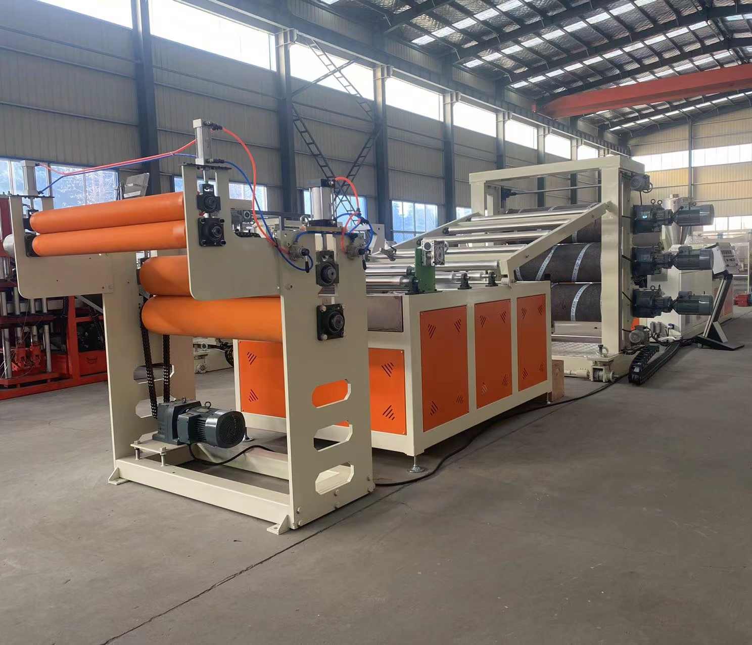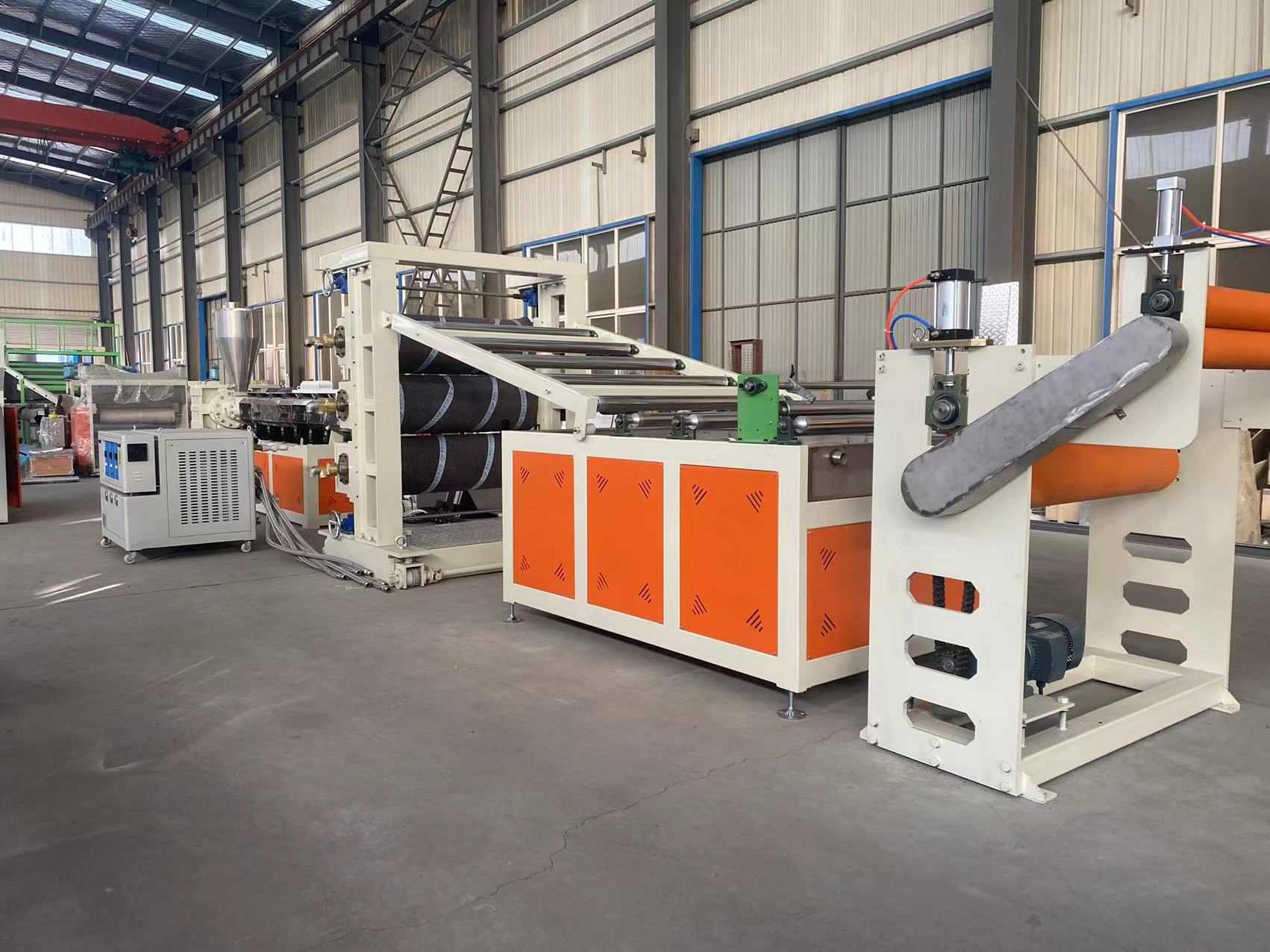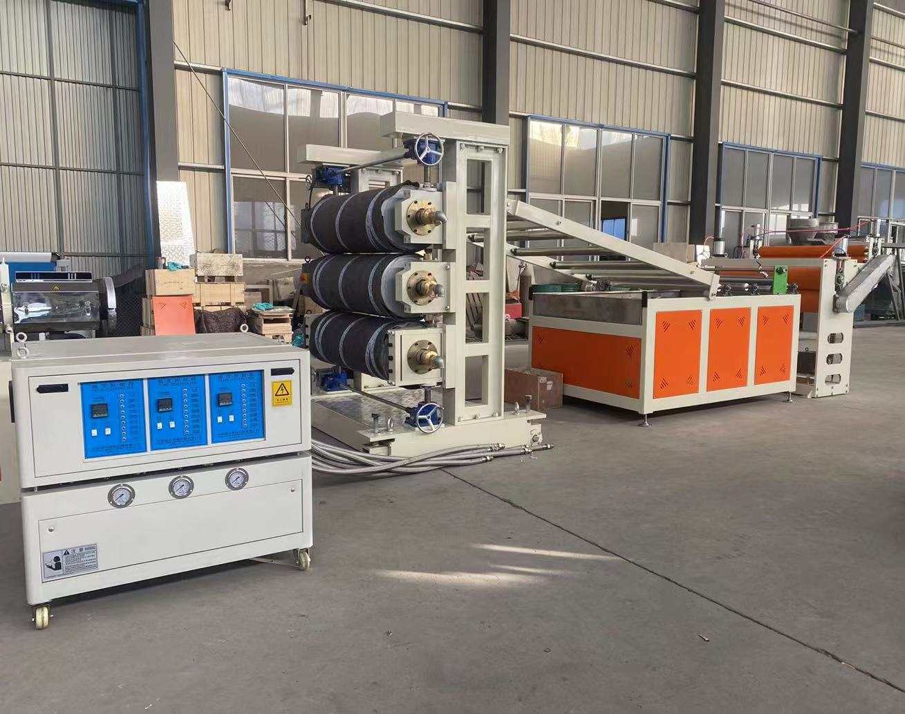 PVC-kristallplaatide tootmisliini tootmisliin: see tipptasemel tootmisliin on konstrueeritud PVC läbipaistvate plastlehtede tootmiseks, mille laius on 200–600 millimeetrit ja paksus 0,8–3 millimeetrit. Selle muljetavaldav valik sisaldab ühe kruviga ekstruuderit SJ90 või SJ-120, kohandatavat T-kujulist painduvat stantsi ja vertikaalset või 45-kraadise kaldega kolme rulliga kalendrit. Lisaks on sellel kolm-ühes veetemperatuuri regulaator, roostevabast terasest jahutusklamber koos laia laiusega reguleeritava trimmeroaga, kummist rulliga veomasin ja kahe asendiga õhku paisuva võlli kerija.